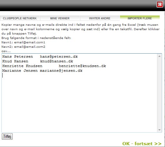 4. Importer flere: Denne fane benyttes, når du fx har et Excel-ark med en kolonne med navn og en kolonne med emailadresse. Du kan her kopiere dem alle over og sende en invitation til alle på én gang. Se nedenstående illustrationer: