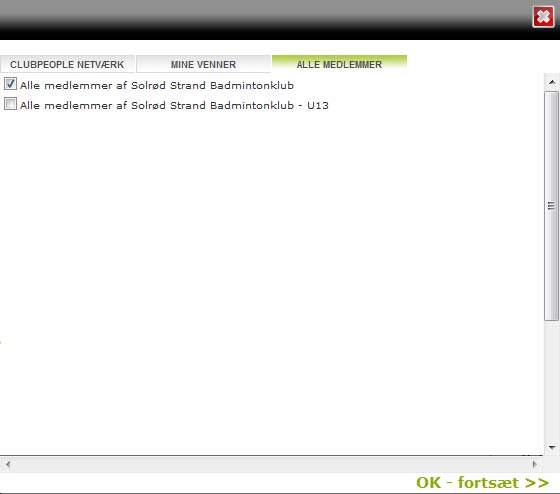 Her sættes hak i den klub, eller den gruppe, der skal have beskeden. Efter der er sat hak, klikkes på ”OK – fortsæt >>”.