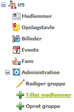Hvis du ikke har menupunktet ”Administration” under gruppen, er det fordi, at du ikke er administrator for din klub. Her skal du kontakte den person, der står som administrator for din klub og bede ham/hende om at tilføje dig som administrator. Du finder gruppens administratorer ved at klikke på gruppens navn (på ovenstående billede klikker du på ”U9”).