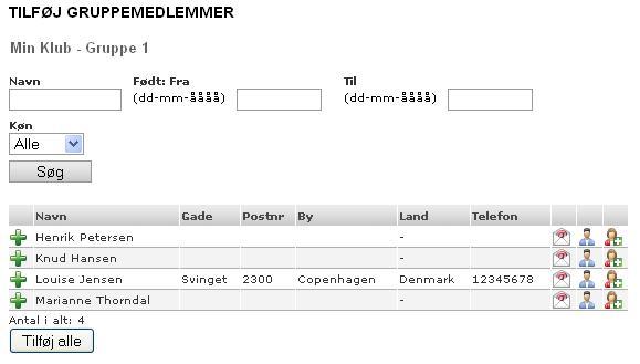 (Inden tryk på ”Søg” kan du filtrere søgningen ved fx at søge på alder (Født: Fra og Til). På den måde kan du fx få vist alle der passer under alderen. Men det kræver at dine medlemmer har udfyldt deres fødselsdato på deres profil)