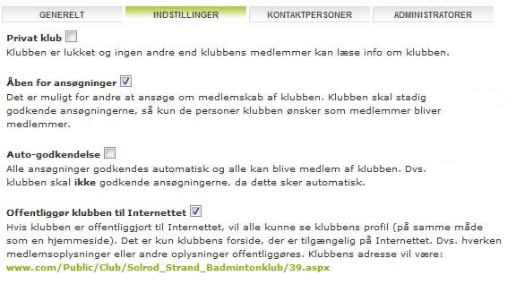 Din klub er nu offentliggjort til Internettet på egen adresse og har fået det direkte link, som står under indstillingerne.